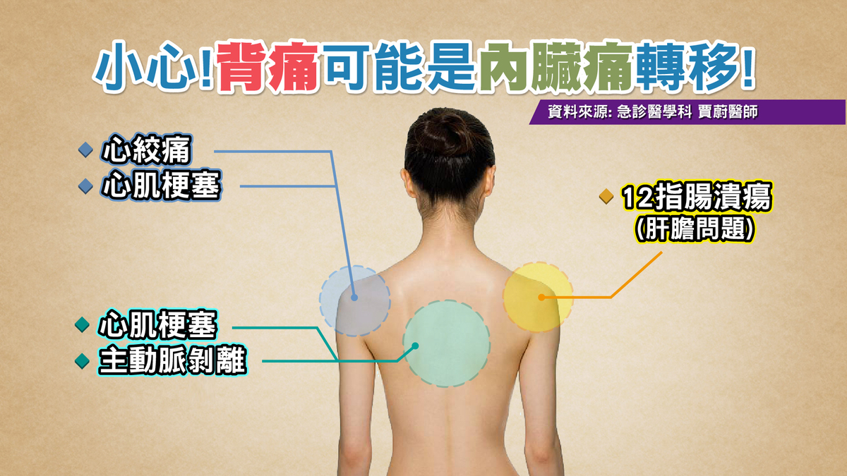 台大物理治療學系助理教授趙遠宏,曾遇過一位40幾歲的男性上班族,左上背長期痠痛,一開始以為只是久坐辦公室,坐姿不良導致,到門診觸診後發現狀況不太正常,經詢問後發現病患有心律不整的問題,才發現病人是慢性的心肌梗塞,導致背痛情況。聖保祿醫院醫療副院長賈蔚提醒:「背痛是五臟六腑發警訊的大平台!」內臟疼痛發作時,有時會被形容為壓迫感或燒灼感,但患者通常無法明確說出正確位置,所以定位不易,有時甚至還會有轉移痛的情形發生!因為傳遞內臟疼痛和皮膚疼痛的神經有相交,但是皮膚疼痛又比內臟疼痛更容易傳送到神經中樞,所以內臟痛的初期,有時會被身體誤判為是皮膚傳來的疼痛,也就是所謂的轉移痛!要如何區別真的背痛還是轉移痛?賈蔚表示:「如果是真的背痛,用手壓會找到肌肉的痛點,但因器官造成的轉移痛,按壓痛處時不會產生太大的差別。」而當左肩疼痛時,可能是心臟動脈的問題;當右肩疼痛時,可能是肝、膽、腸及胃出了狀況。
