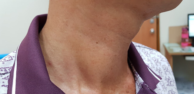 的醫師有做鼻鏡檢查咽喉, 於是我在門診就直接幫他安排健保的24小時胃酸合併阻抗檢測,在插入監測管的過程中, 病患因為檢測管在喉頭打轉刺激 而有點嗆咳. 結果..臉紅脖子粗地用力咳嗽下. 等等..我發現脖子的右邊有若隱若現的突起, 再用手摸一摸 一顆約4公分大的腫塊. 於是在做完24小時為酸鹼檢測後, 也送他一個脖子的電腦斷層. 結果證實是.......5公分大的 良性 甲狀腺結節..(推薦閱讀:甲狀腺生病,竟然會產生這麼多惱人的症狀!「6個自然療法」幫助你遠離困擾!)