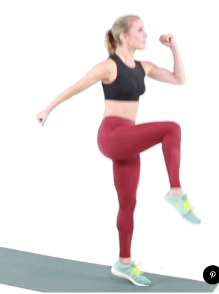 - 左腳伸直小跳躍並將右膝帶到身體前方。